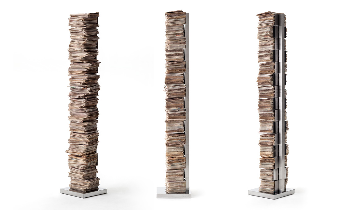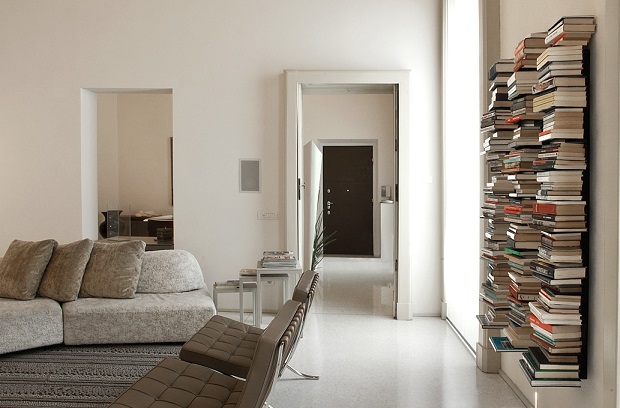 A prima vista può sembrare una semplice colonna con sottili mensole realizzata totalmente in metallo, ma in realtà l'effetto finale è quello della leggerezza data dai libri che appaiono come sospesi.